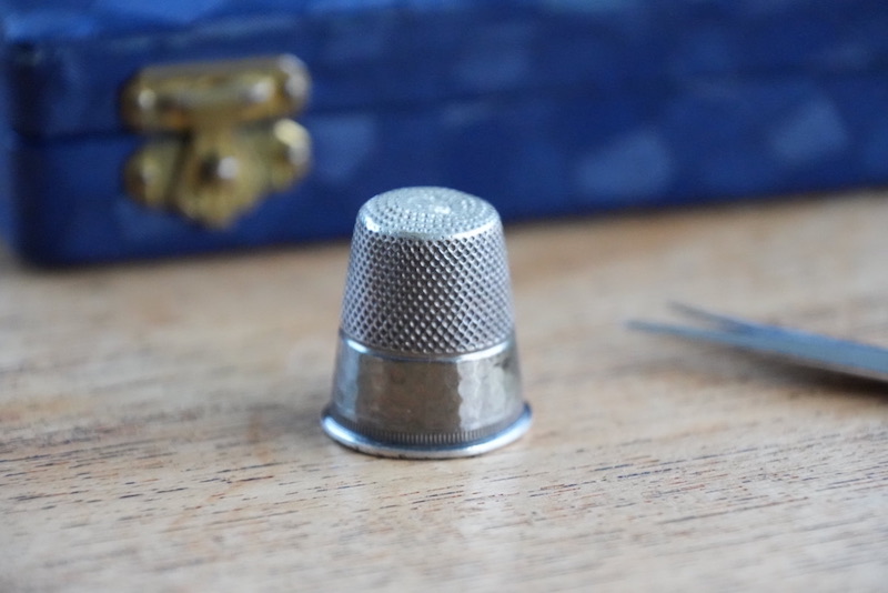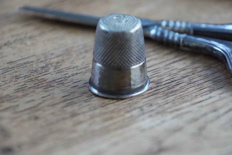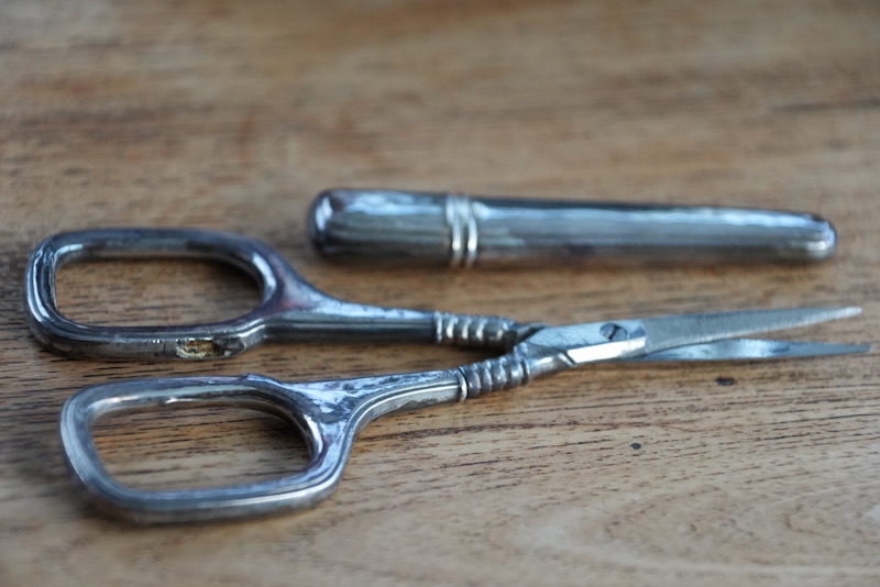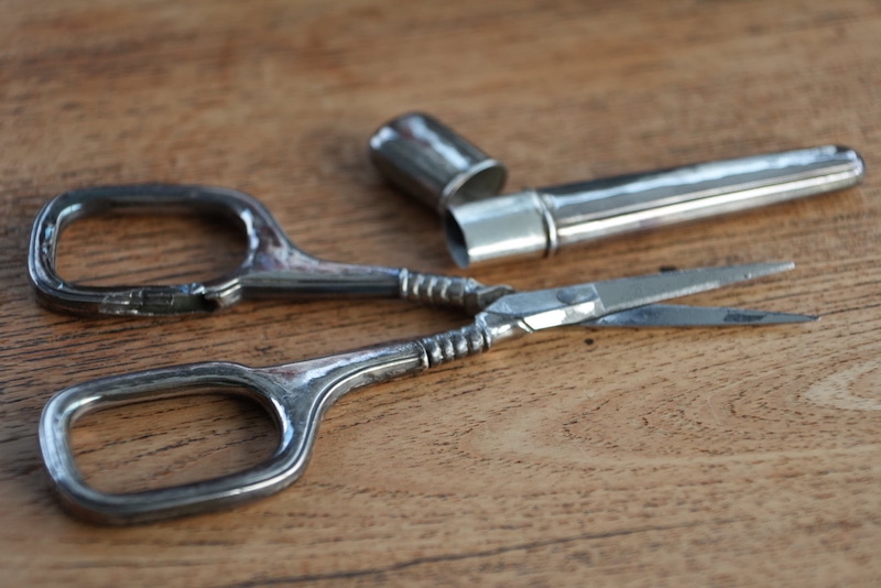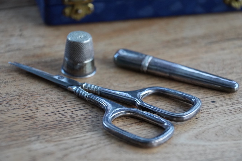 3 delig naaisetje van zilver uit Noorwegen. ca. 1930 Handvat van de schaar heeft gebruikssporen 13cm x 8cm